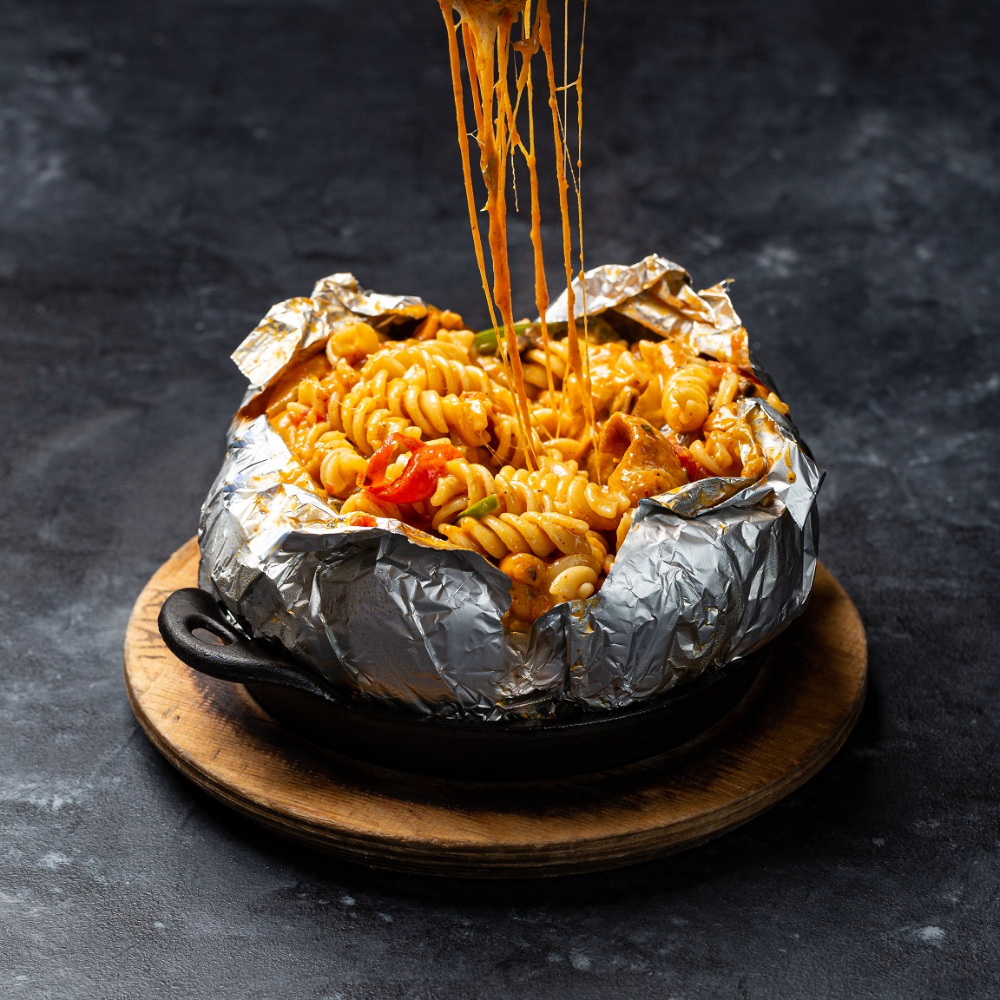 Pasta with pink sauce, Mushroom, Mix Cheese , Chicken
